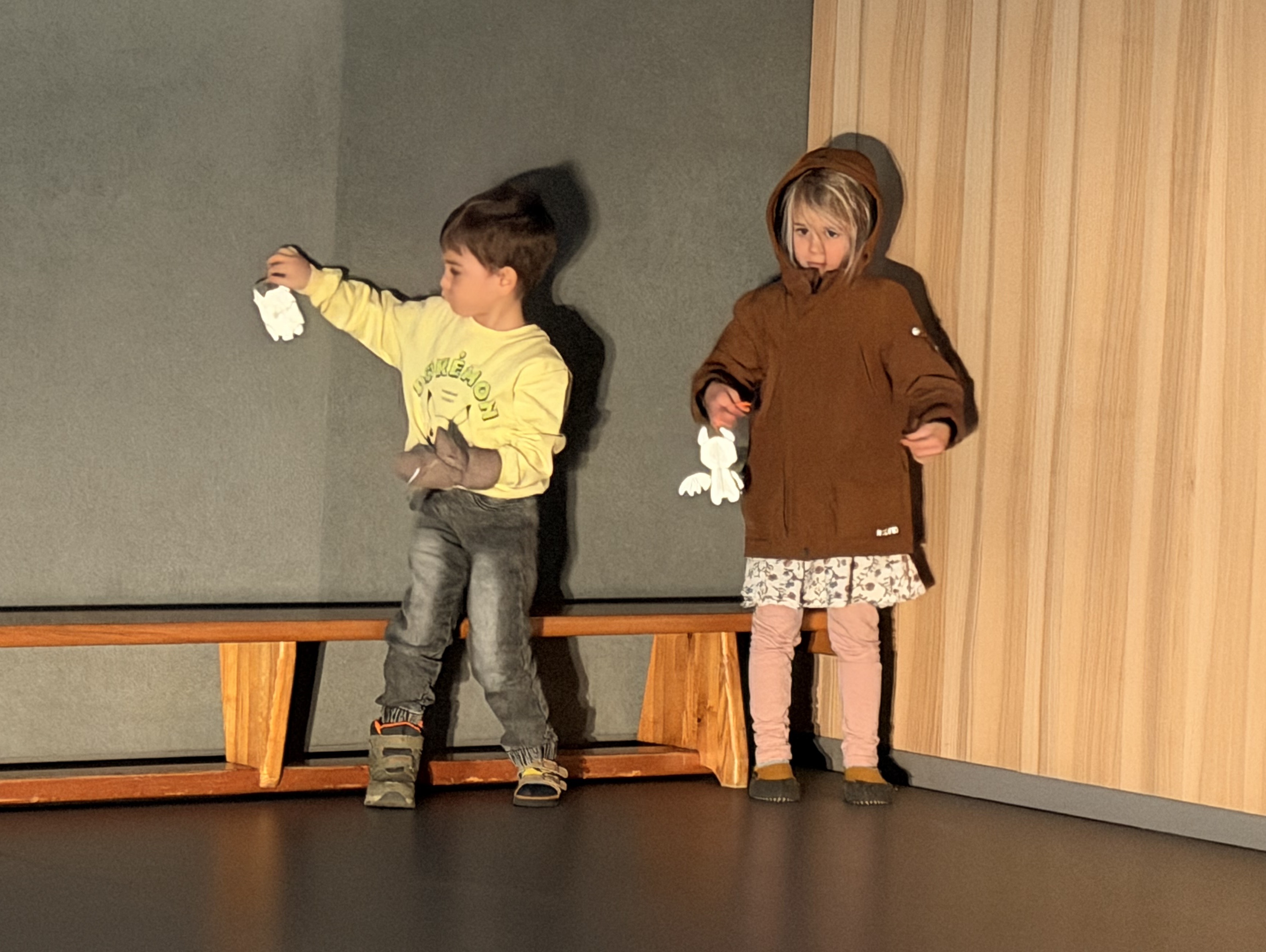Im dunklen Bewegungsraum probierten wir aus, ob wir in der Dunkelheit gut gesehen werden, ob irgendetwas an unserer Kleidung leuchtet, zB Jacke, Schuhe, Kindergartenrucksack.